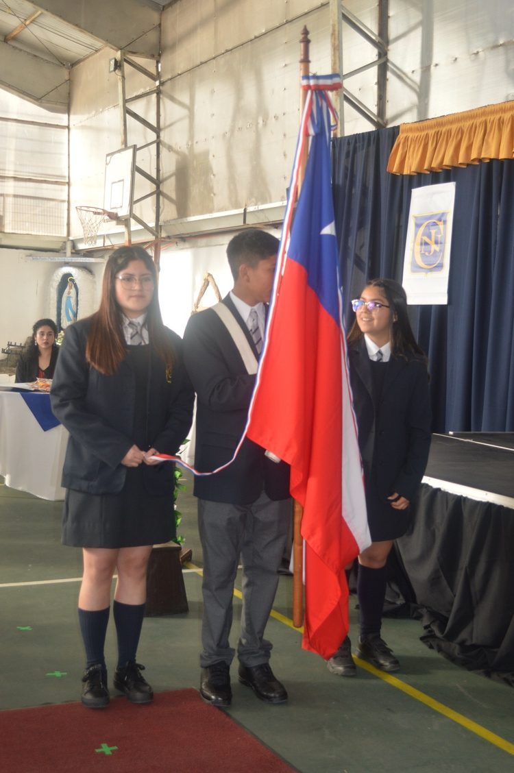 Reciben el estandarte: Nicolás Alfonso Garcés Arratia y sus escoltas Paz Valentina Maldonado Suazo y Catalina Ignacia Sánchez Morales.