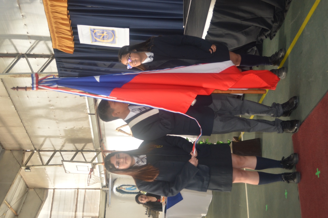 Entregan el Emblema Patrio los estudiantes: Matías Exequiel Maldonado Palma y sus escoltas Dámaris Ornella Cofré Suazo y Solange Aracely Parra Aburto.