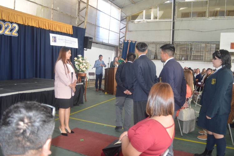 Reciben el Emblema Patrio los estudiantes: Juan Andrés Concha San Martín y sus escoltas Constanza Alexandra Aburto Espinoza y Josefa Emilia Inostroza Ruiz.