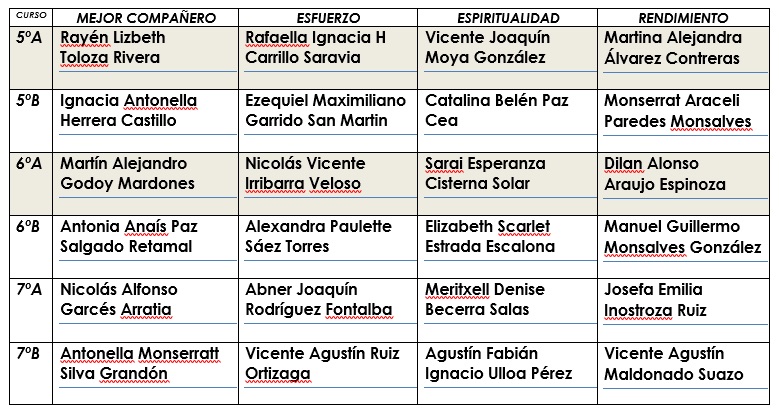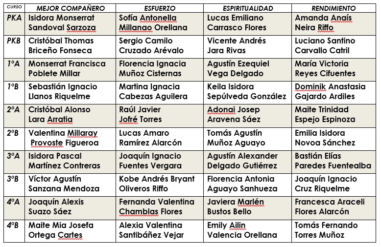 Se destacaron a los estudiantes en los siguientes criterios: Mejor Compañero, Mayor Esfuerzo, Espiritualidad y Mejor Rendimiento.
