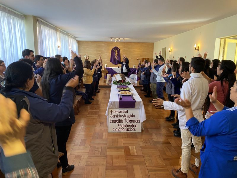 Una vez concluida la liturgia de los estudiantes, el personal del colegio se reunió para participar en una celebración más íntima, al estilo del carisma y espiritualidad de la Congregación Hermanas del Niño Jesús.