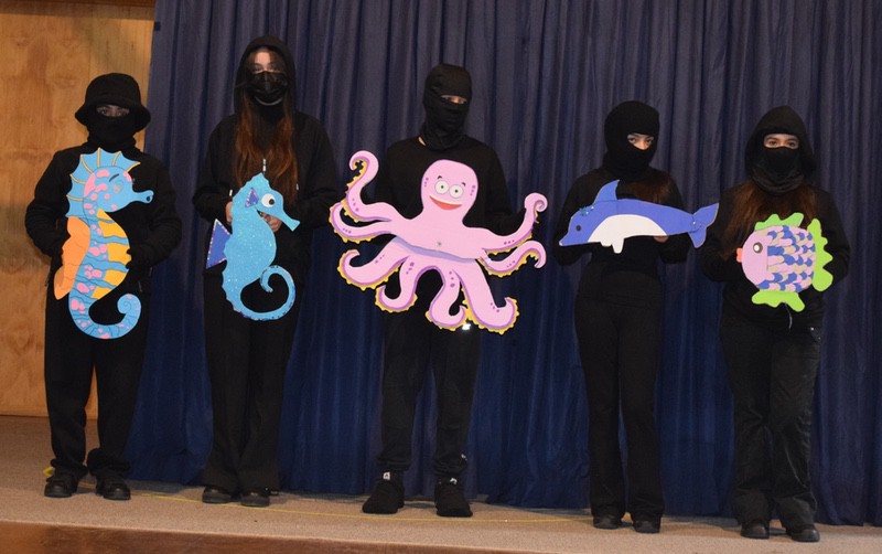 Los estudiantes de 7ºB presentan diversas especies del mundo sudacuático elaboradas por ellos en el Taller. El profesor realiza el relato de la importancia del fondo marino.