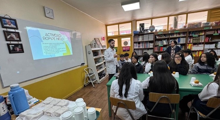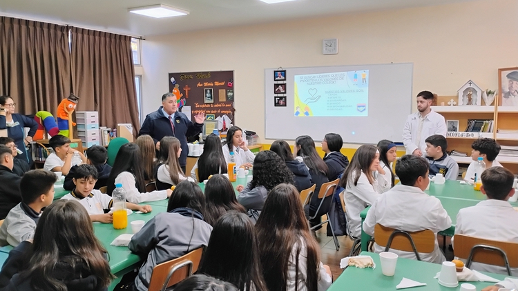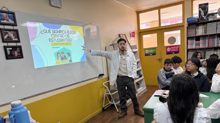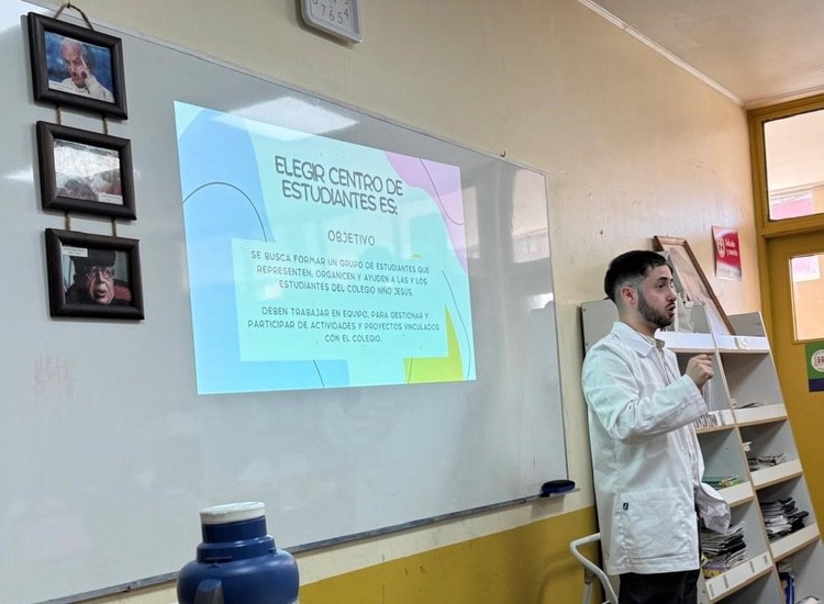 El profesor Samuel Parra Muñoz, profesor de Historia y Geografía, asesor del Centro de Estudiantes del Colegio Niño Jesús de Lota organiza una reunión informativa para las directivas de los cursos del segundo ciclo.