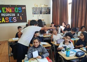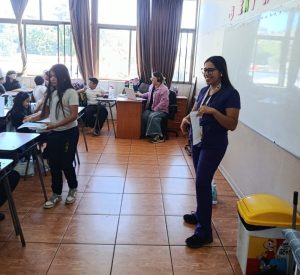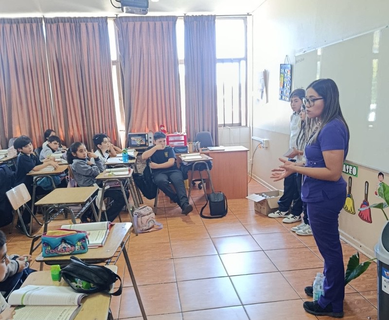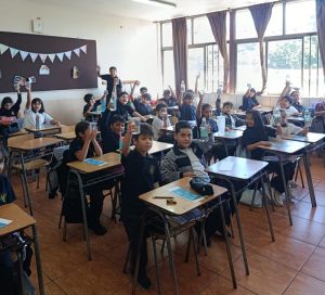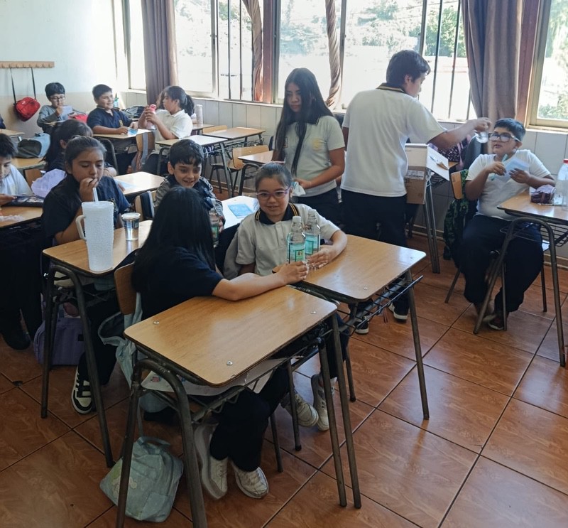 Intervención en Aula (Post-recreo – Monsalve 162): La Brigada de Vida Sana, a cargo de la profesora Vivian Farías Ballestero, se dirigió específicamente a las salas de los 4º Básicos, realizando una breve charla educativa de 10 minutos. Los estudiantes reciben su vaso de agua y folletos para reforzar el hábito de hidratación dentro del aula.
